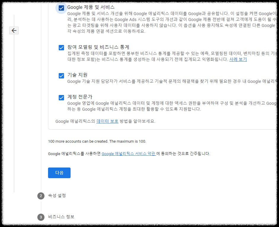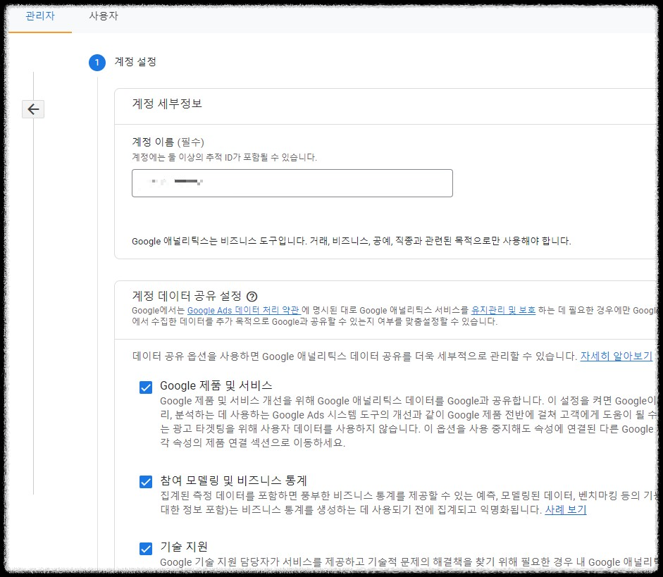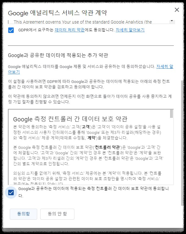 둘다 체크를 하고 동의함을 클릭하면 애널리틱스 계정이 생성 됩니다.