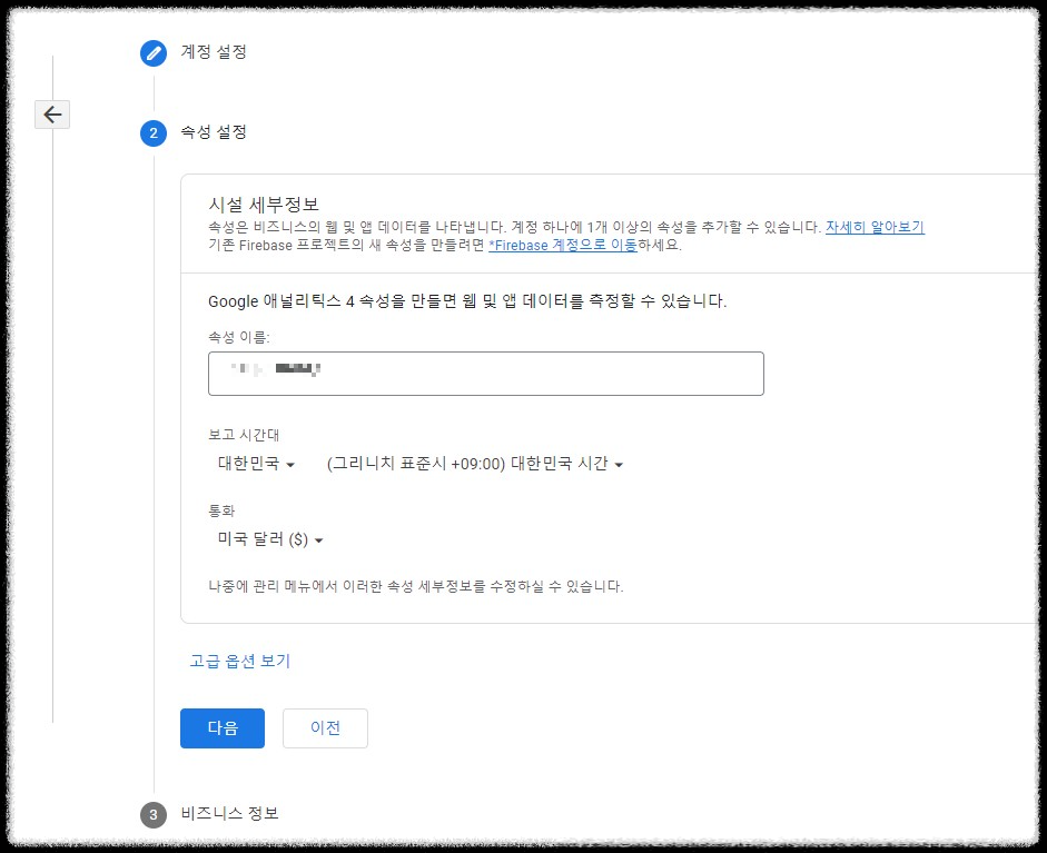 속성 이름을 넣어주고 "보고 시간대"는 대한미국을 넣어 줍니다. "통화"는 미국 달러로 둡니다. 여기서 고급 옵션 버튼을 누르면 유니버설 애널리틱스 속성 만들기를 할 수 있습니다.
