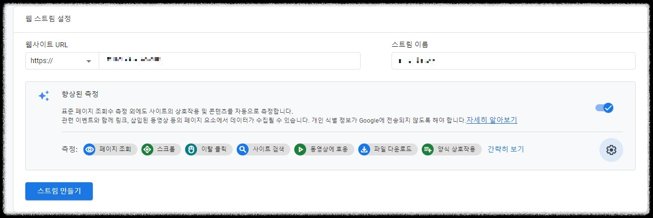 본인의 사이트를 입력하고, 스트림 이름도 넣어 줍니다. 스트림 만들기 버튼을 클릭합니다.