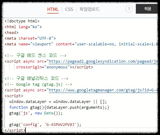 복사한 태그를 티스토리 HTML 편집에서 <head> </head> 사이에 넣습니다. 저는 애드센스 코드 바로 다음에 넣었습니다. 그리고 적용을 해줍니다.
