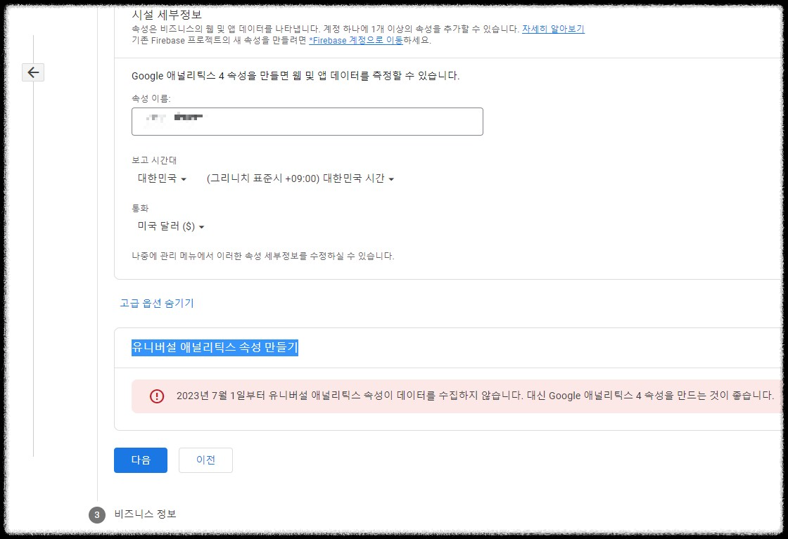 그런데 유니버설 애널리틱스 속성은 23년7월1일 부터 데이터를 수집하지 않는다고, GA4 속성으로 만드는 것이 좋다고 합니다. 다음을 클릭합니다.