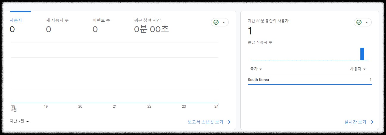적용 되었는지 확인 하려면 본인의 사이트에 다시 접속을 합니다. 그리고 애널리틱스 홈에 접속을 합니다.